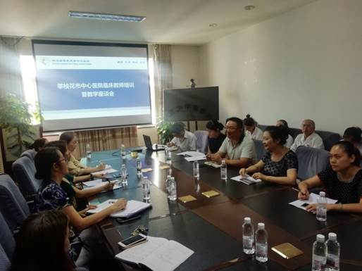 根据攀枝花学院教学模式创新的工作部署,康养学院师生积极践行“18+2”实践周活动。2019年7月4日下午,为更好地开展产教融合及医教协调育人工作,确保教学质量,康养学院兰玛院长、刘文全副院长带领教学管理相关老师一行6人,前往攀枝花市中心医院(攀枝花学院第二临床医学院)进行了临床教师培训暨教学座谈。攀枝花市中心医院党委副书记张月辉主持会议,科教科科长刘爱君、护理部主任张静等参加了会议交流。