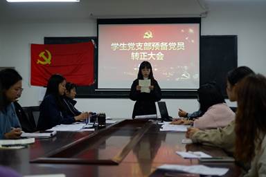 教学院会议室召开预备党员转正大会。会议由学生党支部书记张丽主持,学生党支部全体党员同志参加此次会议。党总支书记杨领航以普通党员身份参加此次会议。