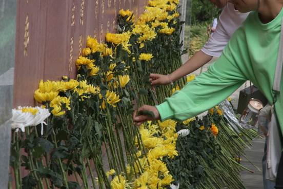 在工作人员的带领下,参与本次活动的同学领取菊花和先烈事迹材料后步行前往纪念碑。到达目的地,在庄严的氛围中,同学们阅读先烈英雄事迹,将先烈精神铭记心底,怀着对革命先烈崇高的敬意和无限的哀思献上鲜花,加深自己心中的红色印记。
