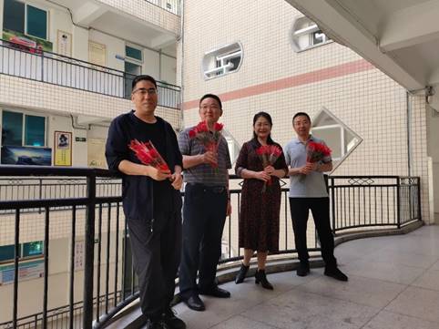 康养学院院领导班子为工作在一线的老师献花,康养学院院长兰玛、党总支书记林伟、党总支副书记刘文全、副院长冯奇为康养学院在一线工作的教师献花。