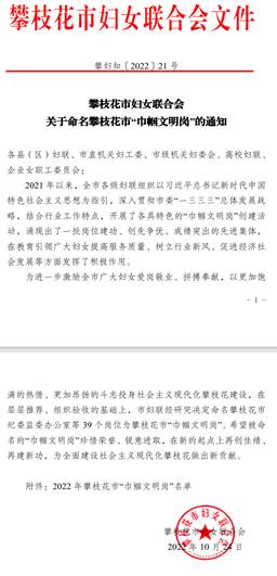 近日,攀枝花市妇女联合会发布《关于命名攀枝花市“巾帼文明岗”的通知》,授予攀枝花学院康养学院“攀枝花市巾帼文明岗”的称号。