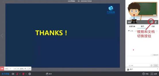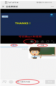 2、老师点上课后方可以看到老师视频头像和文档,聊天区可以发送文字信息。问答区可以提问。使用切换按钮可以将文档和视频互换展示位置(向右滑动也可),视频可以横屏全屏播放。