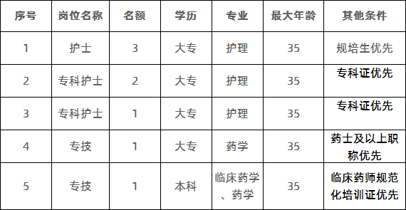 4.岗位按招聘名额与考生人数1:1,护士招聘根据理论、技能、面试三者之和的平均分值从高到低排名,确定正取体检人员。如分值相同,则另行命题面试并列者,确定正取体检人员。药剂科专业技术人员招聘根据总成绩从高到低确定正取体检人员。如分值相同,则另行命题面试并列者,确定正取体检人员。
